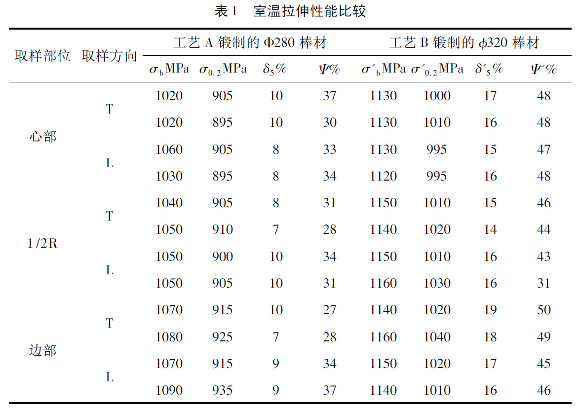 通過單相區變形量大于70%和兩相區采用拔長變形,變形量大于85%的鍛造工藝,可以獲得同一截面上各點組織均勻性較好、力學性能完全符合標準及用戶使用要求的φ320mm大規格棒材。