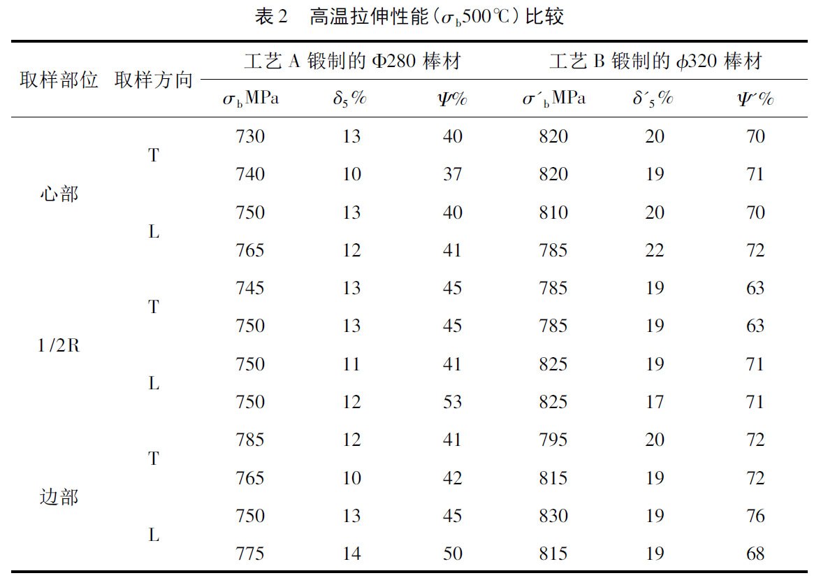 分別在兩種鍛制工藝得到的成品棒材的中心、1/2R、邊部各點制取橫向和縱向試樣,試樣經950℃/1h.AC+530℃/6h.AC熱處理后,進行室溫力學性能和500℃高溫力學性能測試,測試結果見表1和表2,接著對鍛制的φ320mm規格成品棒材熱穩定性、高溫持久性和沖擊性能進行測試,測試結果見表3。