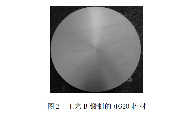 工藝B采用鑄錠加熱至相變點以上較高溫度,進行1~2火自由鍛變形,單相區變形量大于70%,采用特殊鍛造方法,走圓-圓系變形。然后進行均勻化處理,再在兩相區加熱,進行多火的特殊鍛造方法以及工序控制方法,兩相區變形量為85%以上,最終鍛制得到直徑為φ320mm規格成品棒材。