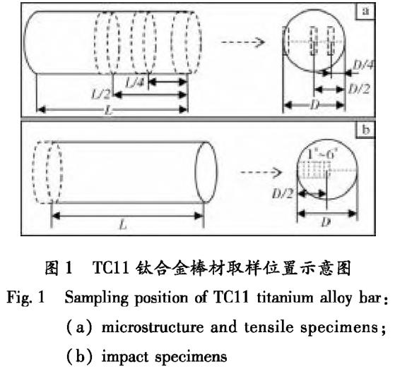 對TC11鈦合金棒材進行970℃/120 min/AC +530 °C/360 min/AC熱處理。按圖1a所示,沿棒材長度(Z)方向分別在L、L/4、L/2處截取0200 mmx20mm盤片,每個盤片沿直徑(D)方向分別在D/4、D/2處取金相試樣和拉伸試樣。采用OLYM-PUS PLAG3光學顯微鏡進行顯微組織觀察。采用INSTRON 8985萬能試驗機進行室溫、高溫拉伸性能試驗。按圖1b所示,在棒材另一端Z處沿D至D/2處平均取6個沖擊試樣,標記為1#~ 6%采用ZBC2602-CE沖擊試驗機進行夏比沖擊試驗(U型缺口),測量試樣的沖擊韌性。