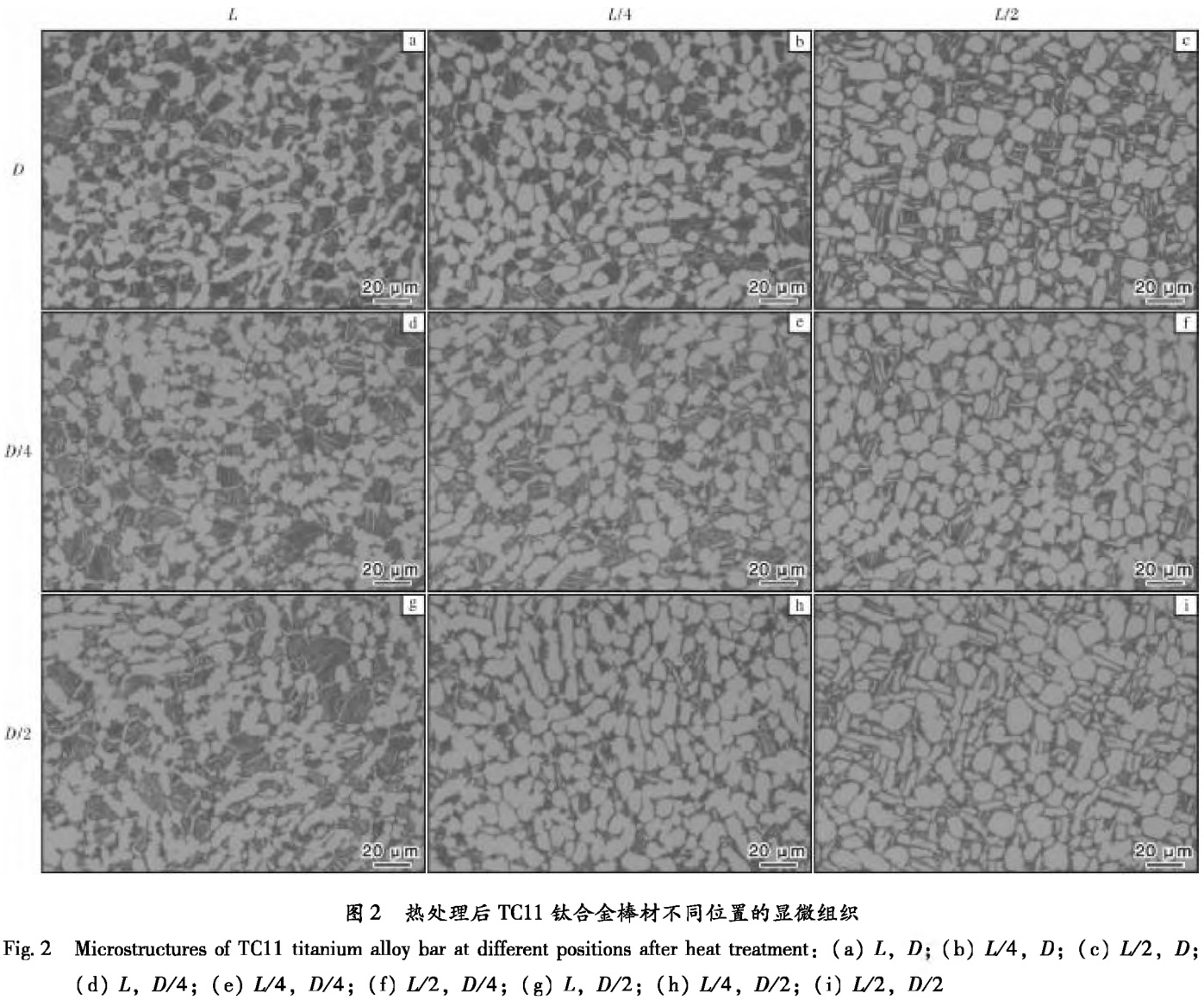 顯微組織主要與TC11鈦合金棒材熱處理過程中的溫度變化有關。TC11鈦合金的導熱性較差,在熱處理過程中存在一定的溫度梯度,在長度和直徑方向上越靠近心部,棒材的冷卻速度越慢,使得初生珀相和次生乂相有足夠的時間緩慢長大,越靠近棒材表面,熱處理后冷卻速度越快,α相來不及長大,同時可以將更多的β相保留下來。