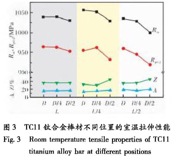 (2) 大規格TC11鈦合金棒材不同位置的室溫拉伸性能變化與顯微組織密切相關。沿長度方向,D/2處的顯微組織差異最為明顯,室溫拉伸性能表現為由邊部至心部抗拉強度逐漸降低,塑性升高。
