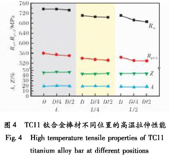 圖4為TC11鈦合金棒材不同位置的高溫拉伸性能。從圖4可以看出,TC11鈦合金棒材的高溫抗拉強度表現出沿不同方向越靠近心部,強度越低。鈦合金的高溫拉伸行為較室溫拉伸行為更加復雜,受多種因素影響,但也主要與顯微組織有關。如前所述,沿長度方向越靠近1/2處,初生αp相、次生αs相含量增加,β相含量降低。觀察厶處沿直徑方向顯微組織變化規律可以發現,越靠近D/2處,初生αp相和β相晶粒長大越明顯。αp相含量增加會降低高溫抗拉強度,同時,次生匕相片層厚度增加、方向性增強,β晶粒尺寸長大等顯微組織的變化,也都會造成高溫抗拉強度的降低⑻。從圖4還可以看出,棒材不同位置的高溫塑性變化不大,說明顯微組織變化對高溫塑性的影響較小。
