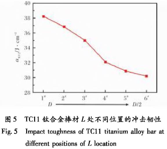 圖5為熱處理后TC11鈦合金棒材L處不同位置的沖擊韌性。從圖5可以看出,沿棒材直徑方向,越靠近心部,沖擊韌性越低。對比厶處不同位置顯微組織可以發現,由D處到D/2處,棒材的初生αp相和次生αs相晶粒逐漸長大,含量增加,對應把β相含量逐漸減少。初生αp相界有利于微裂紋的形核⑼,因此,初生αp相含量增加,TC11鈦合金棒材的沖擊韌性降低。