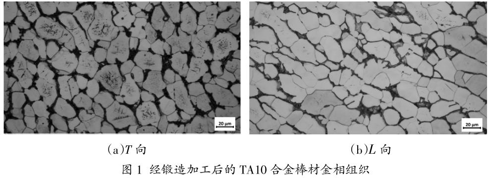 經鍛造加工后的TA10合金棒材金相組織如圖1所示。由圖1可知,棒材的組織為典型的等軸組織,金相組織主 要由初生α相組成,初生α相形貌以等軸狀為主,同時組織中還包含β轉變組織,其位于初生α相之間,β 轉變組織包含次生α相及殘余β相。由圖1還可知,棒材的T向與L向金相略有差異,其中T向相比于L向的組 織中,其初生α相等軸化程度更高,均勻性更好,而L向的組織中,其初生α相形貌等軸化較差,有部分較 為粗大的初生α相。