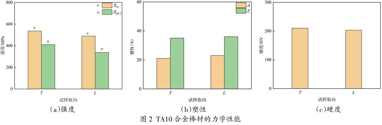 經鍛造加工后的TA10合金棒材的力學性能如圖2所示。由圖2(a)可知,在棒材的拉伸性能方面,其抗拉強 度(Rm)和屈服強度(Rp0.2)均是T向較高,其中棒材T向的抗拉強度為536MPa,屈服強度為410MPa,棒材L 向的抗拉強度(Rm)為489MPa,屈服強度(Rp0.2)為338MPa。由圖2(b)可知,在塑性方面,其T向與L向 塑性性能接近,差異較小,其中棒材T向的斷后延伸率(A)為21%,斷面收縮率(Z)為35%,棒材L向的斷后 延伸率(A)為23%,斷面收縮率(Z)為36%。