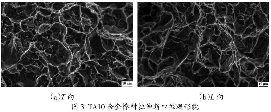 TA10合金棒材拉伸斷口微觀形貌如圖3所示。由圖3可知,棒材T向與L向拉伸斷口微觀形貌幾乎一致,均是以 等軸狀韌窩為主,其中韌窩形貌與數量是體現合金塑性大小的主要依據,當韌窩數量較多且深時,棒材具有 較高的塑性值;當韌性數量較少且淺時,合金具有較低的塑性值。韌窩的產生是由于棒材進行拉伸時,較快 的應變速率會使位錯在滑移過程中產生應力集中,導致組織中的微孔發生形核,在拉伸不斷進行過程中,位 錯運動受到的排斥力降低,微孔內會有少量位錯進入,再次激活位錯源,因為棒材在塑性變形的過程中會不 斷形成新的位錯,導致微孔內會連續不斷地進入新形成的位錯,促使微孔生長,微孔不斷地匯聚在斷口處, 并且留下痕跡,最終形成韌窩[11]。在棒材的斷口微觀形貌中還發現少量的二次裂紋,這是因為組織中存在 β轉變組織,棒材在拉伸過程中,位錯運動受到阻塞作用,導致位錯的運動產生一定偏移所導致,同時在棒 材L向的斷口微觀形貌中有較為明顯的撕裂棱,撕裂棱的出現代表棒材的強度較大,這與棒材實際拉伸性能 一致[12]。
